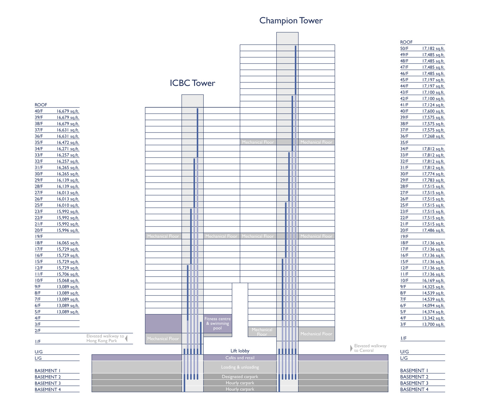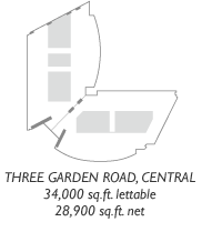 THREE GARDEN ROAD, CENTRAL meets Grade A international standards for office space. Standing 47-storey tall, its two glass towers offer breathtaking views over many of Hong Kong's most iconic landscapes – a commanding structure that offers a world-class working environment.