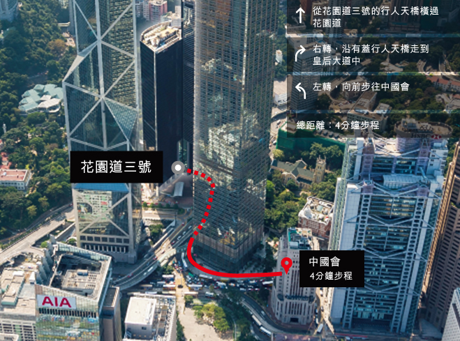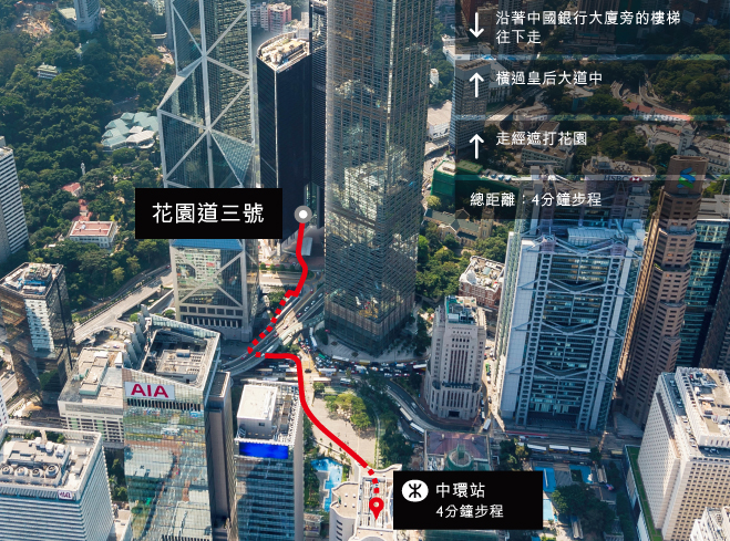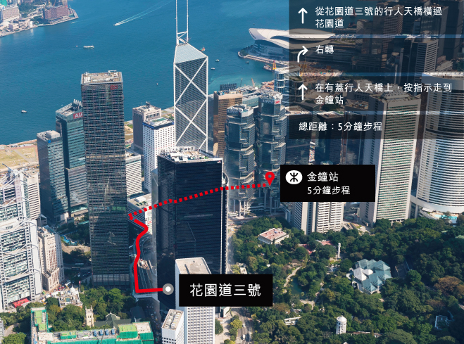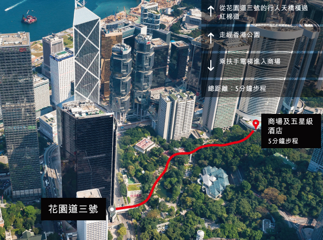 花園道三號位處香港核心地段,來往區內地標也是在徒步範圍以內。配合完善的交通配套,包括連接機場快線的專用穿梭巴士,來往香港每個角落,同樣輕鬆便捷。